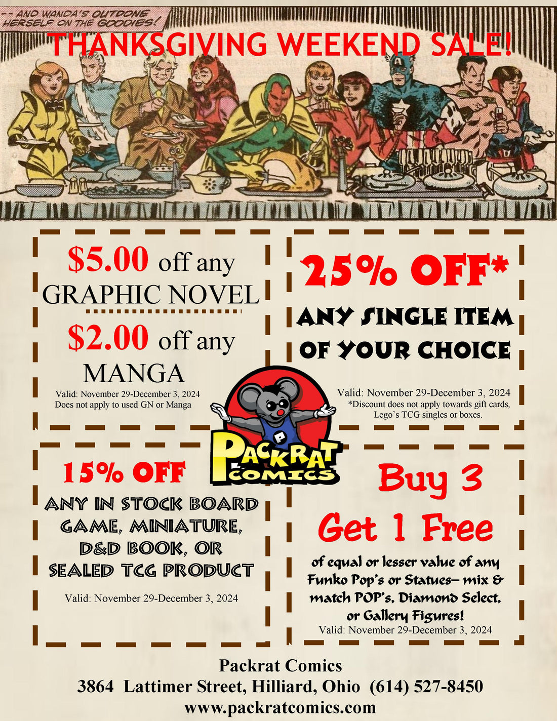 We've got coupons that you can use throughout the weekend. Print out the coupons below or at www.packratcomics.com, show it on your phone or pick up a sheet at the store for a weekend of savings fun! Coupons will be available in store until Wednesday, November 27. Must present coupon for discount.