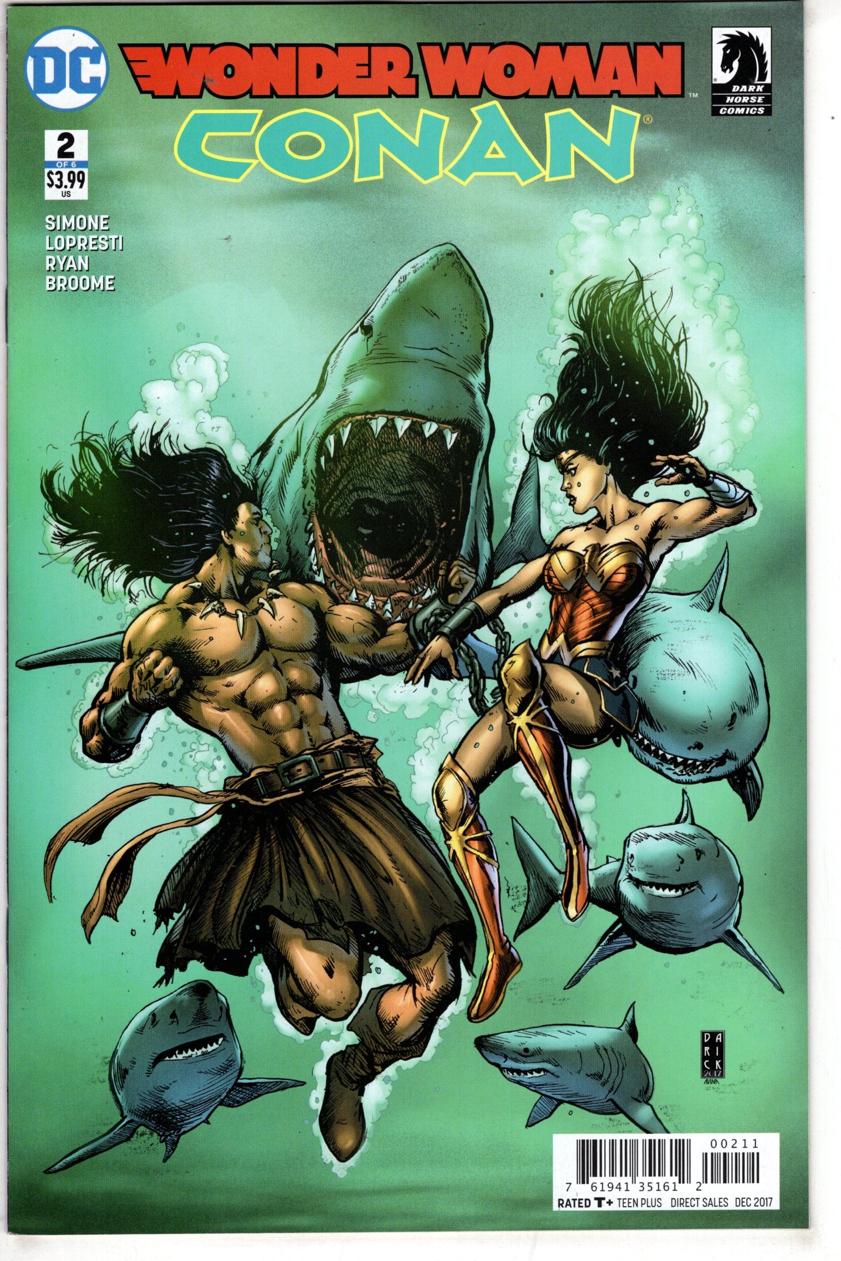 Diana has escaped the Cimmerian gladiator's arena- but she's exchanged that battleground for an equally dire fate. Now she's chained to Conan-the warrior who refused to fight-and they've been sold to a pirate's crew! When their ship founders in a storm- a leap into shark-infested waters seems like the safest course… Co-Published with Dark Horse Comics. RATED T+